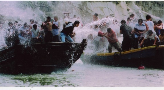 石狮蚶江端午闽台对渡习俗历史源于明清,当时“蚶江为泉州总口,与台湾鹿仔港对渡。大小商渔,往来利涉,其视鹿仔港,直户庭耳。利之所在,群趋若鹜”(见“对渡碑”)。蚶江成为大陆与台湾通航通商的中心码头,郊商百余家,对渡船只300余艘,海交贸易繁荣兴盛。为此,时人每逢端午节,对渡船只相互追逐泼水,交融情谊,互祝吉祥。20世红六十年代至八十年代为中断期,九十年代至今为复兴期。自此,蚶江海上泼水越泼越旺,从原来的小舢舨发展到小机船,安全快速;由过去的男人专项活动,发展到年轻姑娘也上船参与,情趣倍增;由十几艘发展到上百艘,场面更壮观。端午节这一天,蚶江古渡沸腾了,成千上万的观众从四面八方涌向滨海,只见百舸在泉州湾海面上竞渡穿梭,人们用各种勺、桶盛满海水,相互追逐倾泼,男女浴情,热气火红。人们视此水为“吉祥水”、“幸福水”,让这圣水情雨淋个透,可消灾驱邪,以图吉祥、幸福、兴旺。同时,在这一天也举行庙会、采莲、祭江,护航仪式,捉鸭子、赛龙舟等活动内容,将闽台文化、传统文化、美食文化、旅游文化融入其中,内涵更丰富,使之更为魅力。
