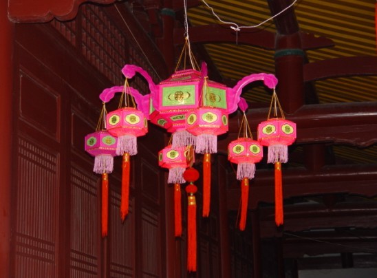 三、挂灯。这是一种挂在雕梁画栋之上,或悬于彩楼棚架之下,体积适中,造型美观,做工精细,色彩艳丽,形态万千。刻纸灯、针刺灯是常见的挂灯。
