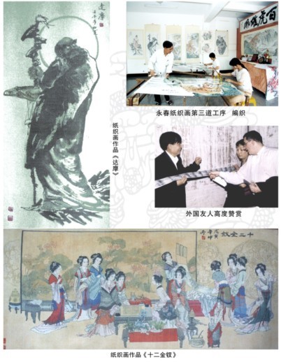 据史书载,隋末唐初,永春就有纸织画作坊,至盛唐时,已有9家专营作坊,延续近千年。永春纸织画制作过程十分精细,有画、裁、织、裱褙等工序,即先在一张宣纸上绘好图画,再用一种特制的小刀,按一定规格细心地裁成一条条纤细的纸条,其宽在2-3毫米,头尾不断,保持一致,此作为经线。再取洁白宣纸,切成大小和经线一样的纸条,作为纬线,然后,用特制的纸织机,双梭交穿,轻轻细织,最后再根据画面需要,补上各种颜色,纸痕交织、经纬分明、画面朦胧、极富立体感。其题材广泛,内容丰富多彩,有中国古典人物,神仙,有壮丽山水,飞禽走兽,也能把油画移进纸质画,内容应有尽有,规格、种类繁多。